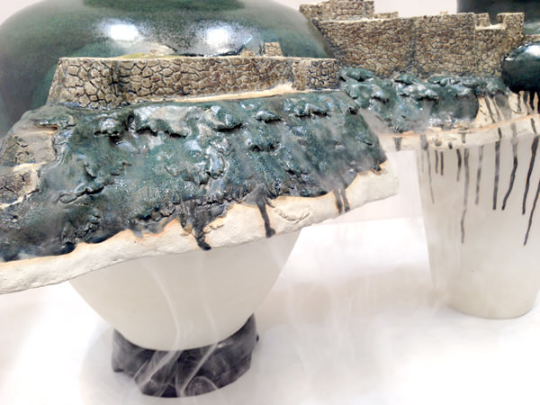 桝本桂子氏の陶芸作品で、「竹田城の加湿器」 名前のとおりに、陶器の竹田城のあらゆる窓のような隙間からスチームが煙のように白くもくもくと出ていました。