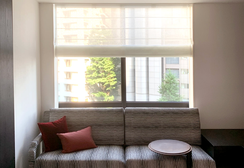窓面は優しいリネンライクの生地を使用してストレートラインにとことんこだわって仕上げたシャープシェードと遮光スクリーンが、共にオートマティックで、より高いホスピタリティのホテルステイを演出しています。