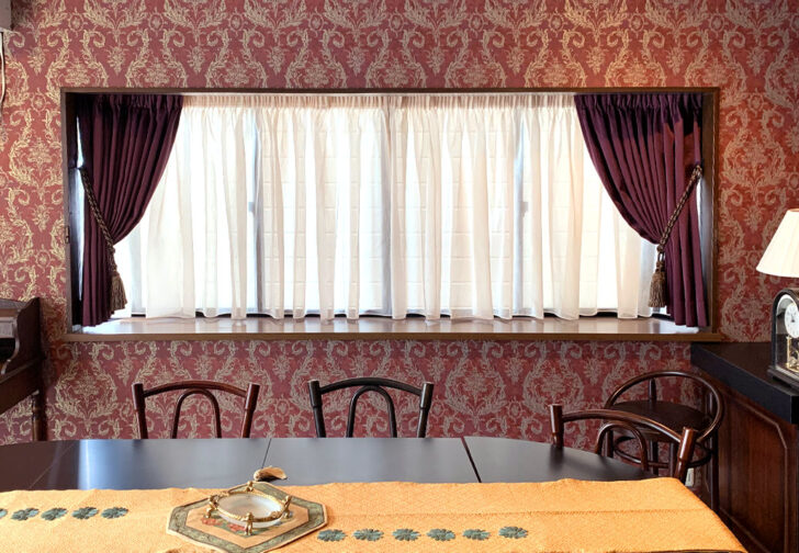グランドピアノのあるサロンにはベルベットのカーテン