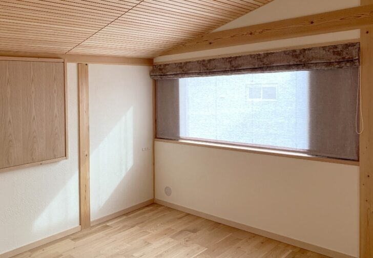 天然木の香りがする窓には色を合わせたダブルシェードと縦型...