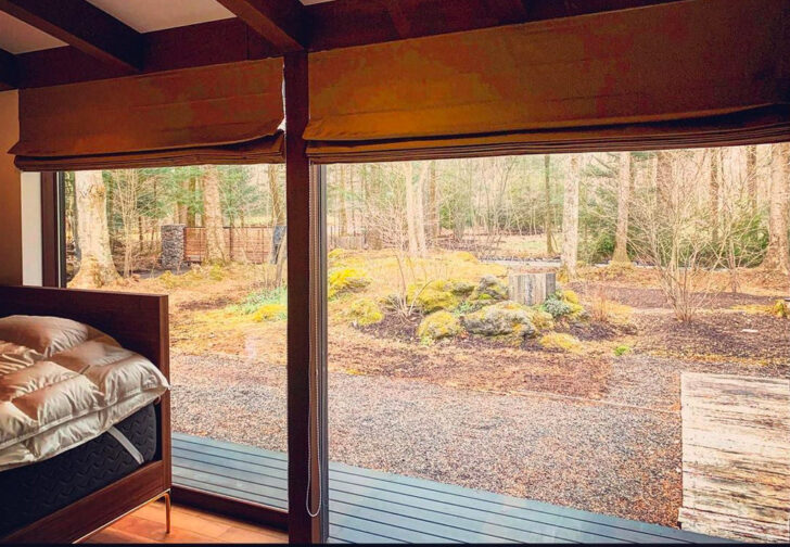 天然木の香りがする窓には色を合わせたダブルシェードと縦型...