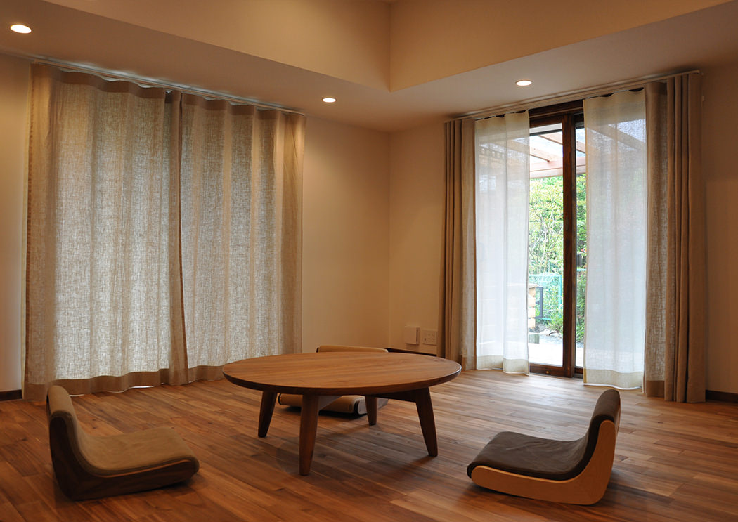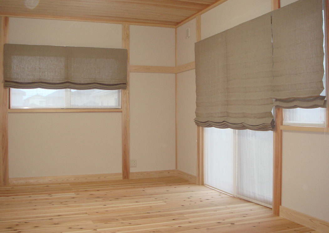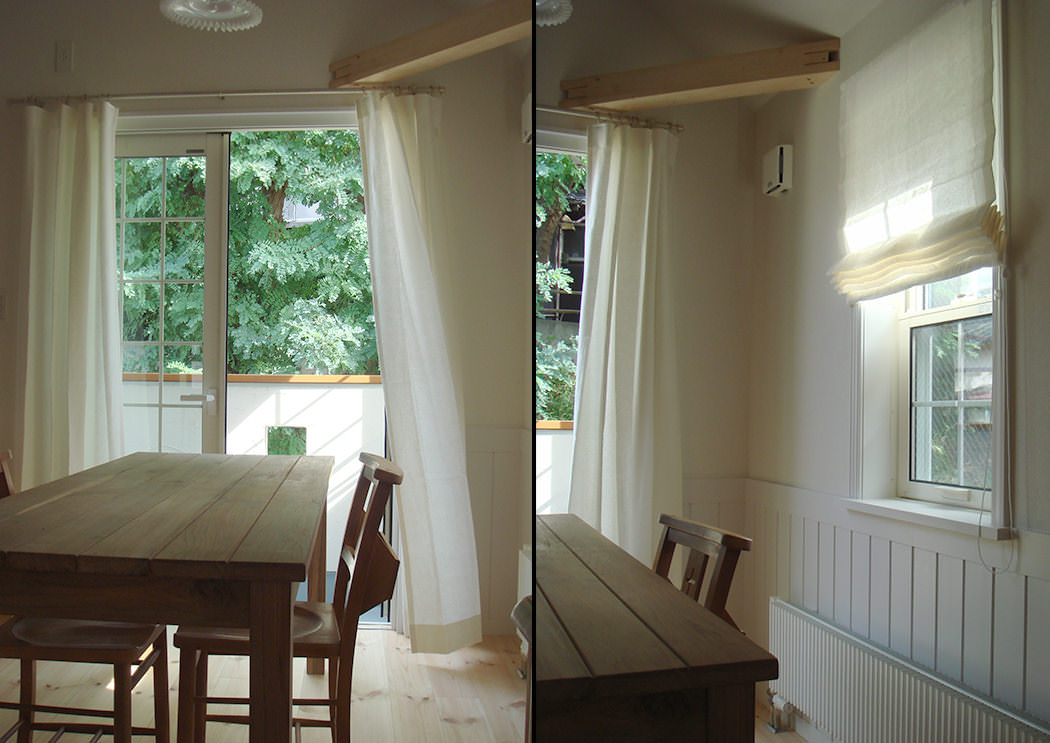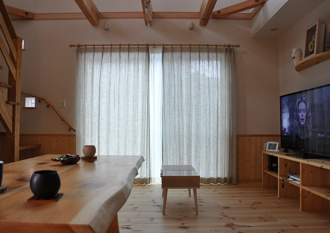 一般的な住宅は、化学加工材の壁や床材が多く仕様されていますが、窓にリネンカーテンを掛ければ、