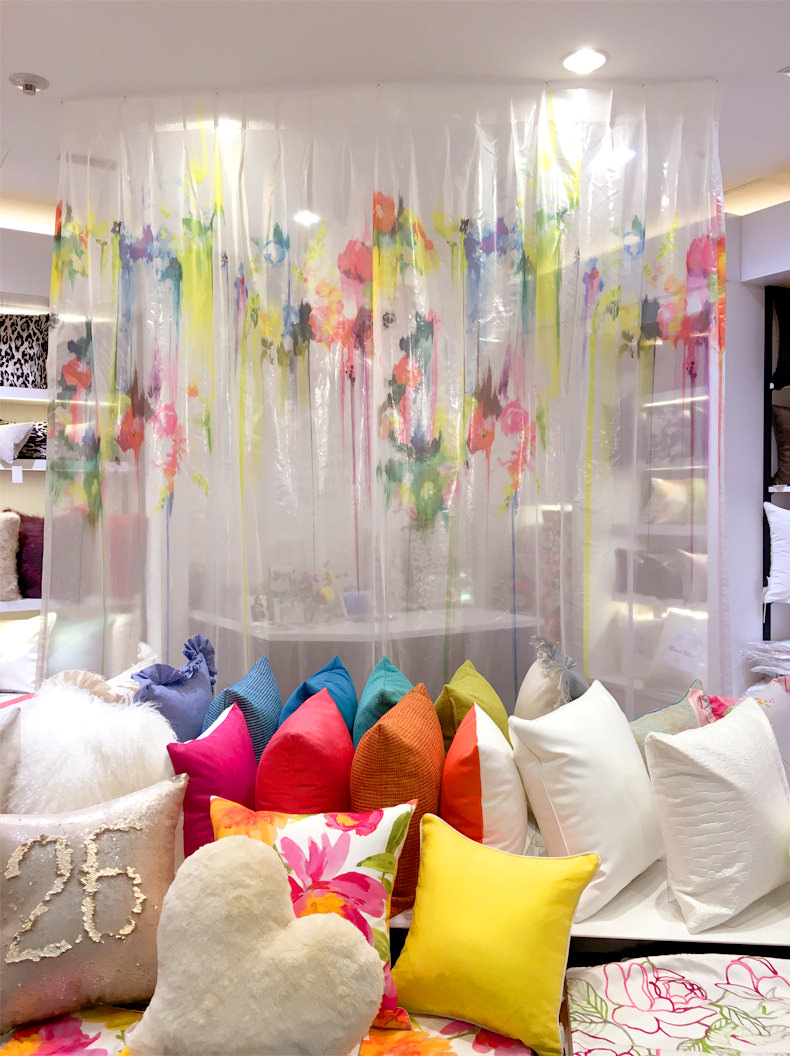 フラワータッチのデザイン画から絵の具が垂れているような斬新な図柄に、ラメ糊のような艶が大変美しいシアーファブリック。