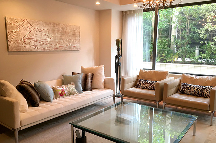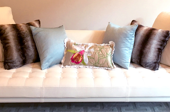 ソファのコーディネートクッションは、シャンタンとモケットで落ち着いた色合いの素材違いを、ミックスでセッティング。