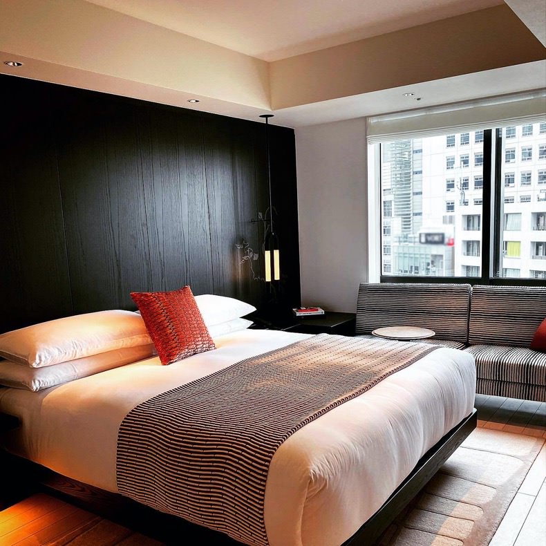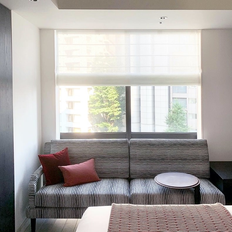窓面は優しいリネンライクの生地を使用してストレートラインにとことんこだわって仕上げたシャープシェードと遮光スクリーンが、共にオートマティックで、より高いホスピタリティのホテルステイを演出しています。