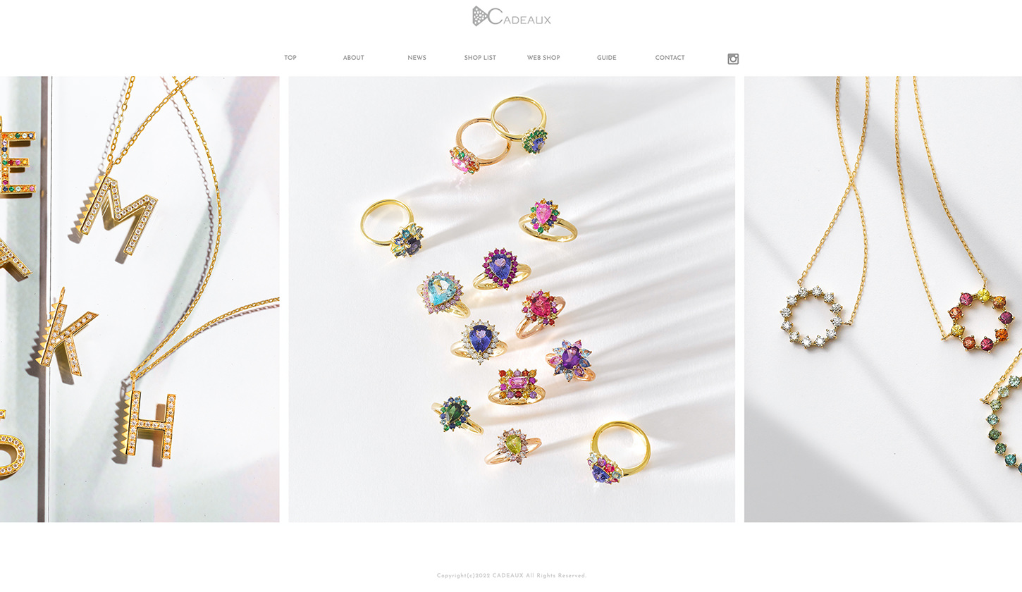 『ファッションにコーディネートをするジュエリー』がデザインコンセプトのCADEAUX(カドー)さんのウェブサイト。 身に着けたときの美しさと心地よさ、ボリューム感やバランス、フォルム、そして素材の厳選と、細部までこだわりを持ったブランドです。 レスポンシブ対応のオンラインショップサイトを実現。 https://www.cadeaux-jewelry.com