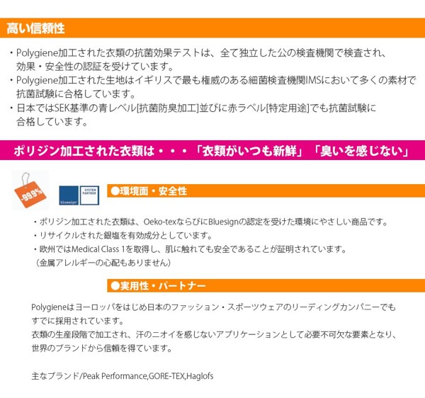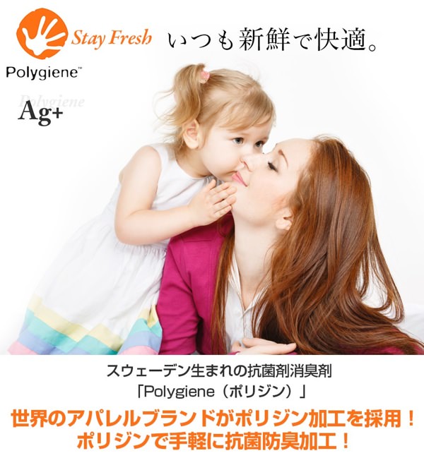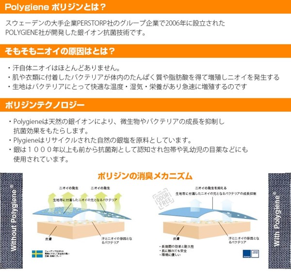 「Polygiene(ポリジン)」は、天然の銀イオンで抗菌+防臭し、バクテリアの制菌、ニオイの元を断ちます。